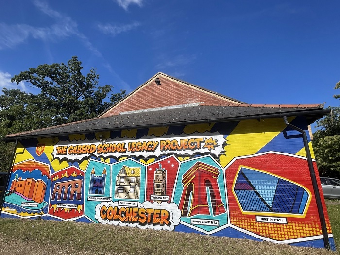 Coordinated by Colchester City Council and funded by Essex County Council Local Community Fund, The Gilberd School Legacy Project has culminated in a stunning mural at the Highwoods Community Centre, celebrating the city’s rich history and development in a vibrant pop-art style.