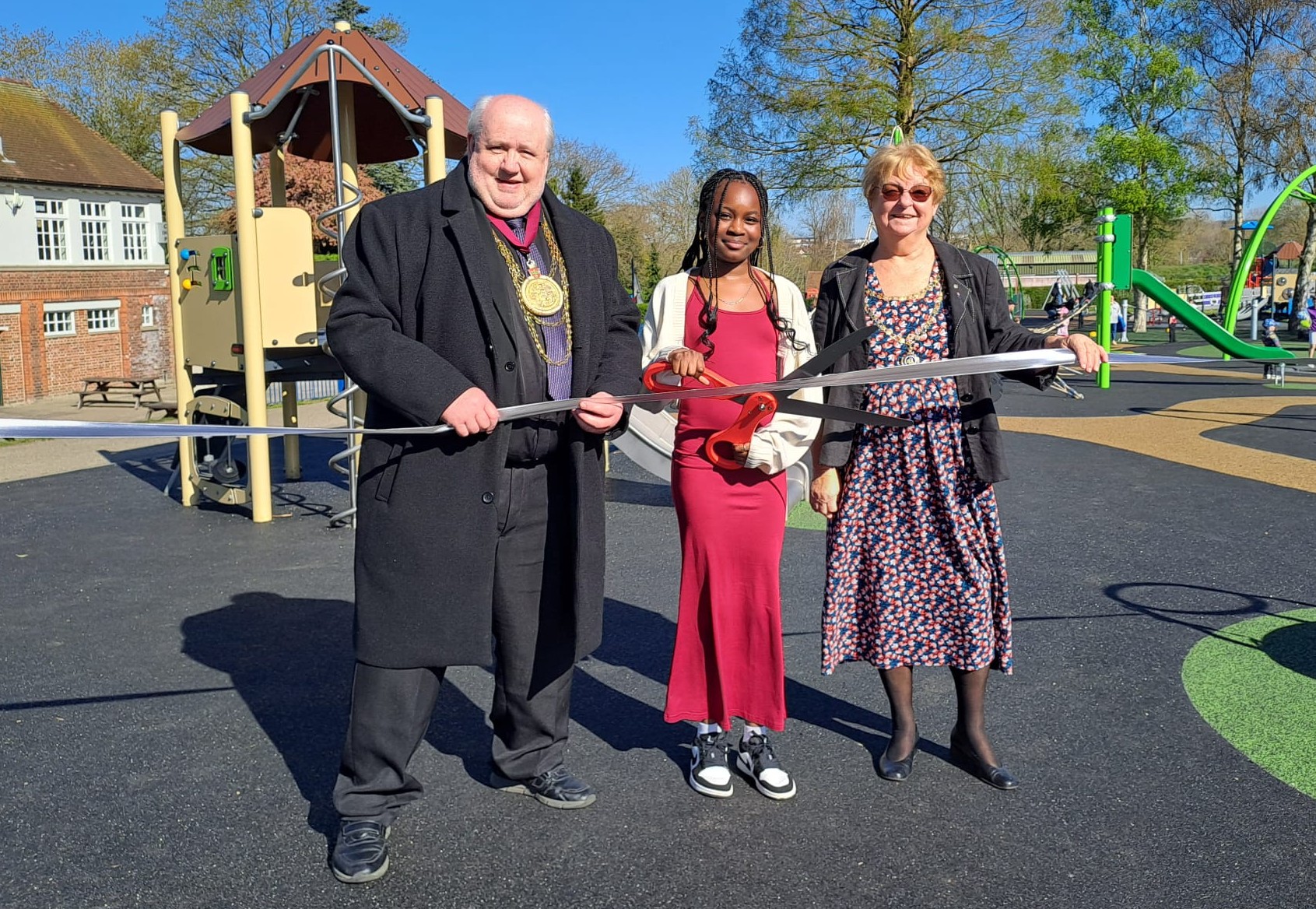 The Mayor and Mayoress were joined by Faith, a pupil from St Thomas More’s School, who won a colouring-in competition linked to the playground project. Together, they used giant ceremonial scissors to cut the ribbon, marking the official opening of the playground in front of invited guests and families.